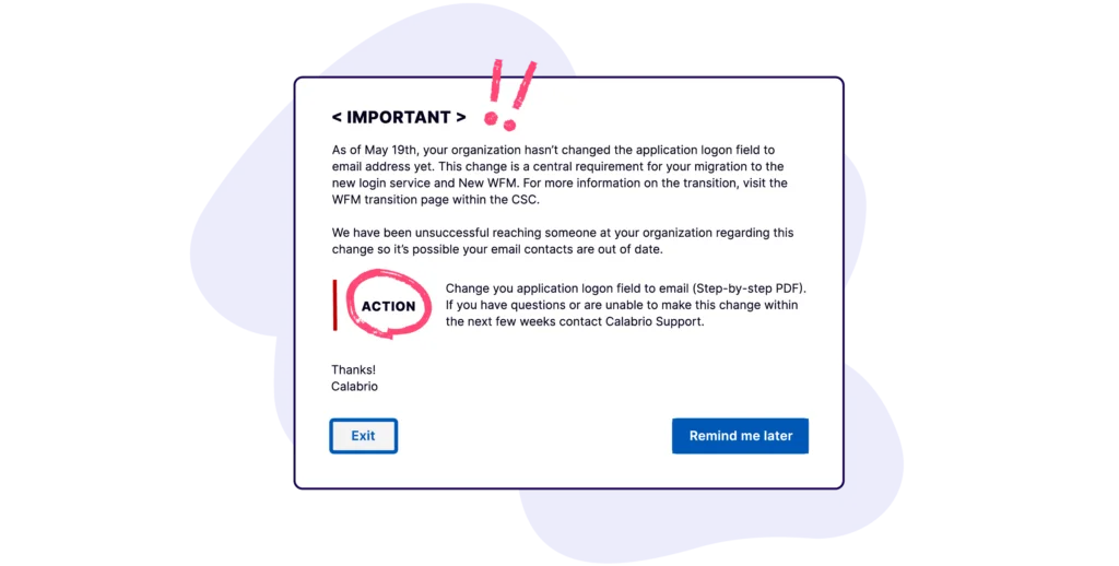 Calabrioがプロダクトの技術アップデートを展開した際、依存関係が生じ、顧客は自分のローカル環境で変更を加える必要が生じました。チームは、この変更を対象のユーザーグループに迅速かつ効果的に伝える方法を必要としていました。