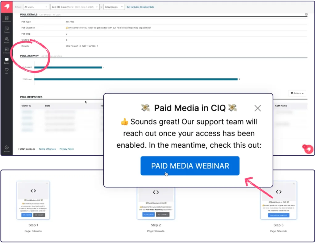 Brophy and his team leveraged a series of Pendo in-app guides to engage with users at various stages of the product building and testing process. They first announced the new feature via a Pendo in-app guide. Following the announcement, the team launched a survey to gauge customers’ interest in learning more about the feature or being contacted to help with testing. “It gave us a list of clients who were ready to activate,” said Brophy. “I was able to see every single user who was ready to use a feature, which we never really had before Pendo. It was the most direct and clear way we’ve ever been able to see intent.”