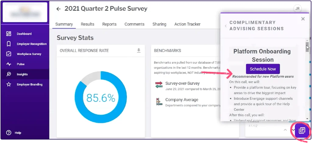 Energage had already been using the Resource Center for sharing things like announcements and product updates. But they wanted to find new ways to get their customers into the product more often. The team also knew it was important to make it clear that customers could sign up for advising sessions whenever they needed them. “Instead of inviting customers [to advising sessions] on a quarterly basis, by [putting it in the Resource Center], they could do it at any time and not have to wait for the invite,” Ramondo explained.