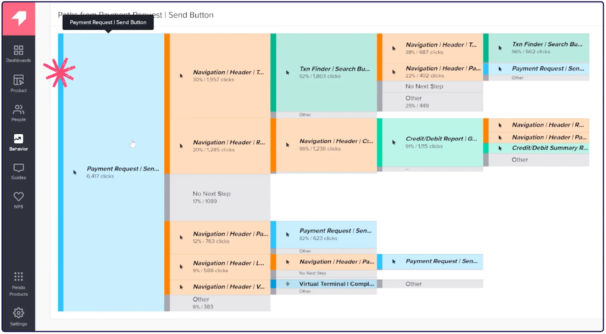 The product team utilized Paths in Pendo and saw that after using the Payment Request feature, 50% of users were then searching for the transaction to ensure it went through. This highlighted what was missing from the new feature: the ability to send a notification when a payment is completed.