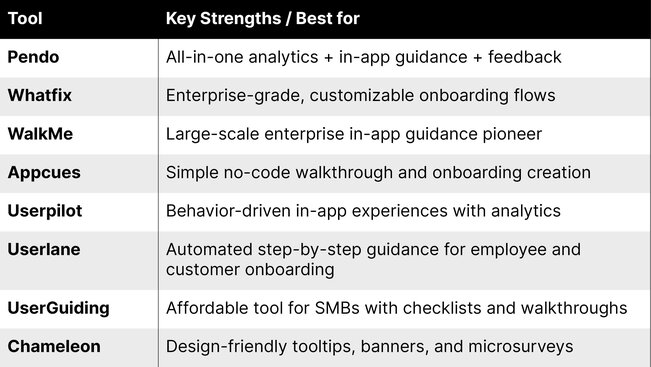 Below, we’ll take you through the top 8 in‑app guidance tools available in 2025, from Pendo’s analytics‑infused platform to specialist alternatives. You can choose the right solution for your business, based on feature needs, scalability, and budget.