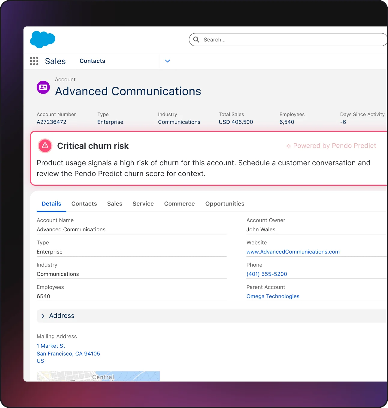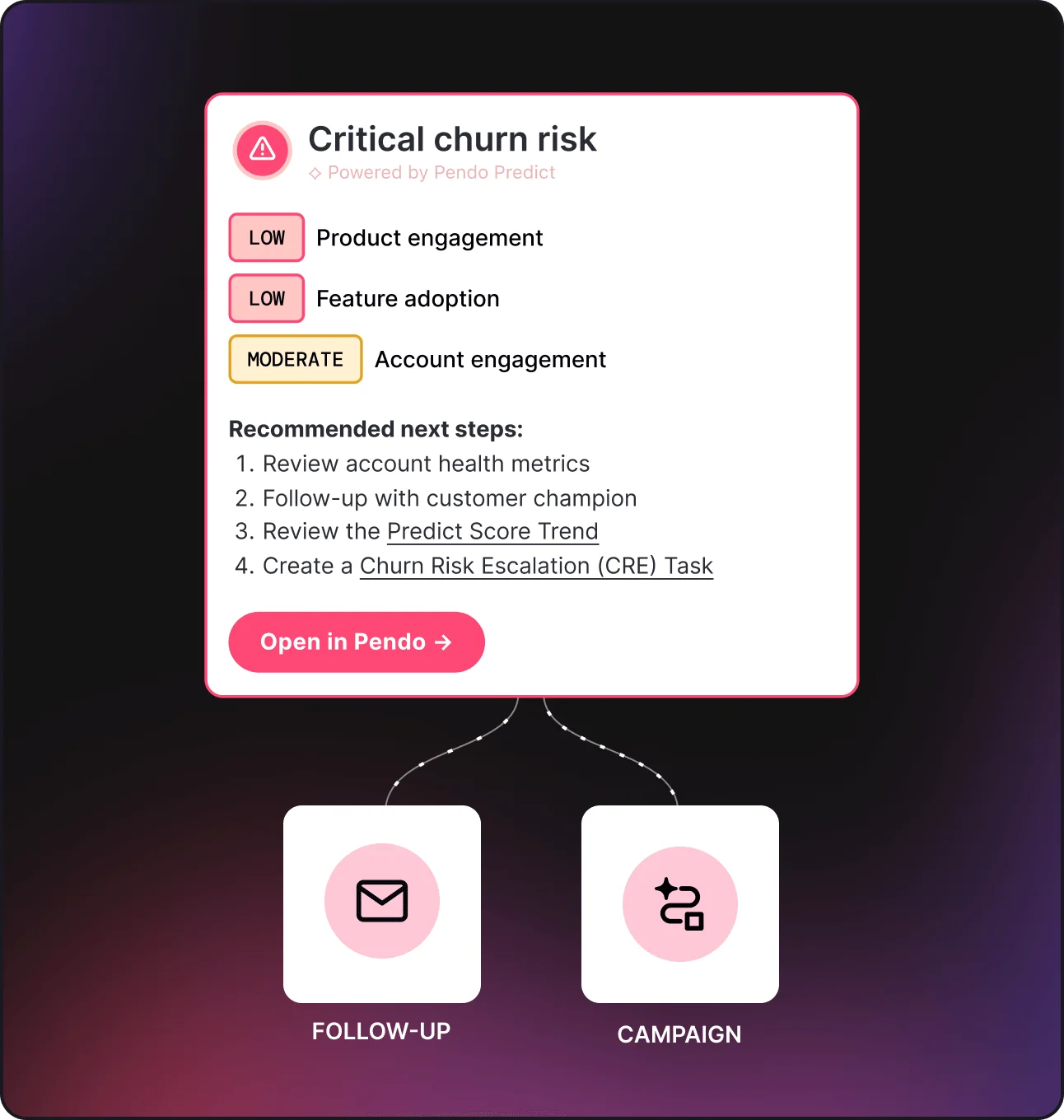 Pendo Predict gives RevOps, Sales, Marketing, and CS teams clear, reliable churn predictions—delivered straight into their workflows—with the context and coaching to act immediately. Early enough so they can change the outcome.