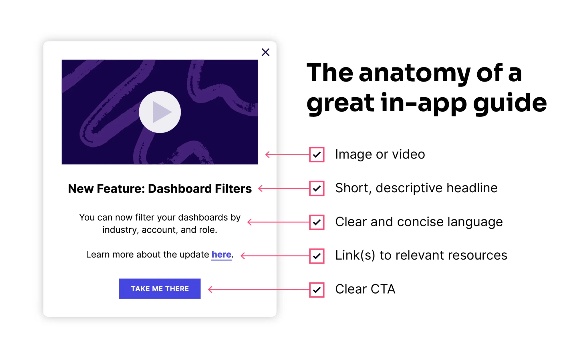 For the visual learners out there, here’s a look at the components of a great in-app guide: